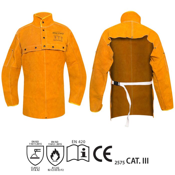 Cape sleeve made with Golden Cowhide split leather. Heat and abrasion resistant to withstand gender welding applications there is riveting to reinforce every major stress point for maximum durability Kevar double-stitching strengthens all seams. The back open for comfort-enhancing ventilation. The underarm gussets enable you to move more freely. It's easier to remove and add the bib.