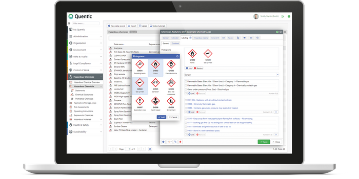 Quentic Hazardous Chemicals simplifies the handling of hazardous and non-hazardous chemicals, improving occupational, health and environmental protection in your company. It assists you in meeting legal requirements, minimizing organizational efforts and providing you with a maximum of transparency in managing hazardous chemicals.
